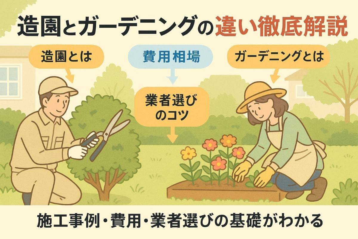 | 造園とガーデニングの違いは? | 造園は庭全体の設計・施工を指し、ガーデニングは個人で楽しむ植物の管理や装飾が中心です。 |